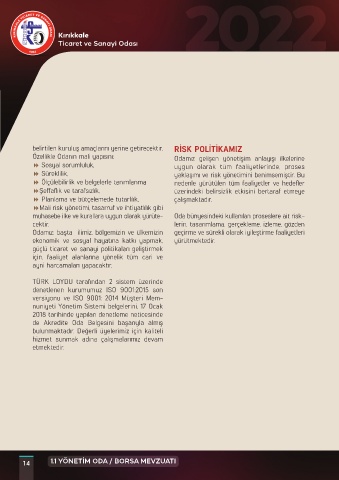belirtilen kuruluş amaçlarını yerine getirecektir. RİSK POLİTİKAMIZ