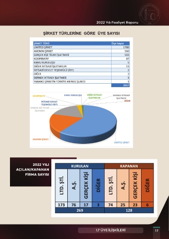 2022 Yılı Faaliyet Raporu ŞİRKET TÜRLERİNE GÖRE ÜYE SAYISI 2022 YILI AÇILAN/KAPANAN FİRMA SAYISI 1.7 ÜYE İLİŞKİLERİ 17