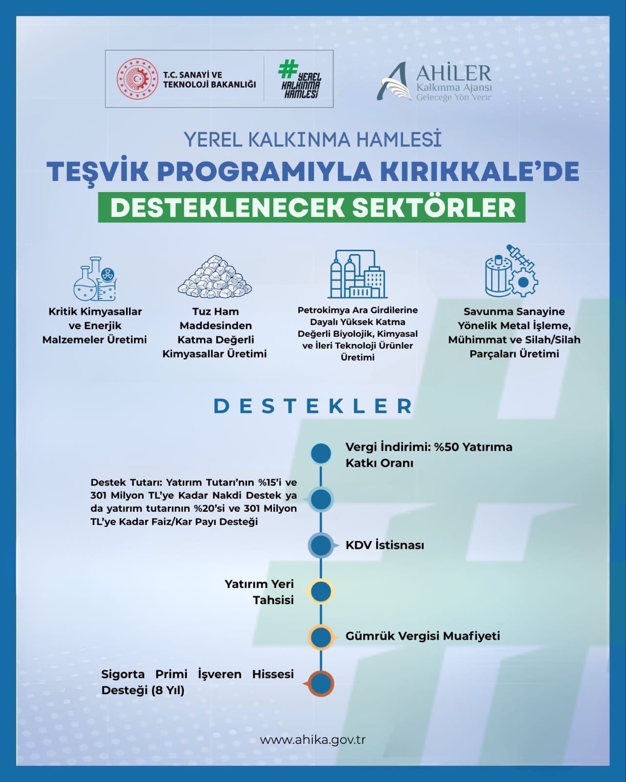 Sanayi ve Teknoloji Bakanlığı tarafından Kırıkkale’de uygulamaya alınan Yerel Kalkınma Hamlesi Programı kapsamında, aşağıda belirtilen yatırım konularına yönelik özel teşvik paketi uygulanacaktır: