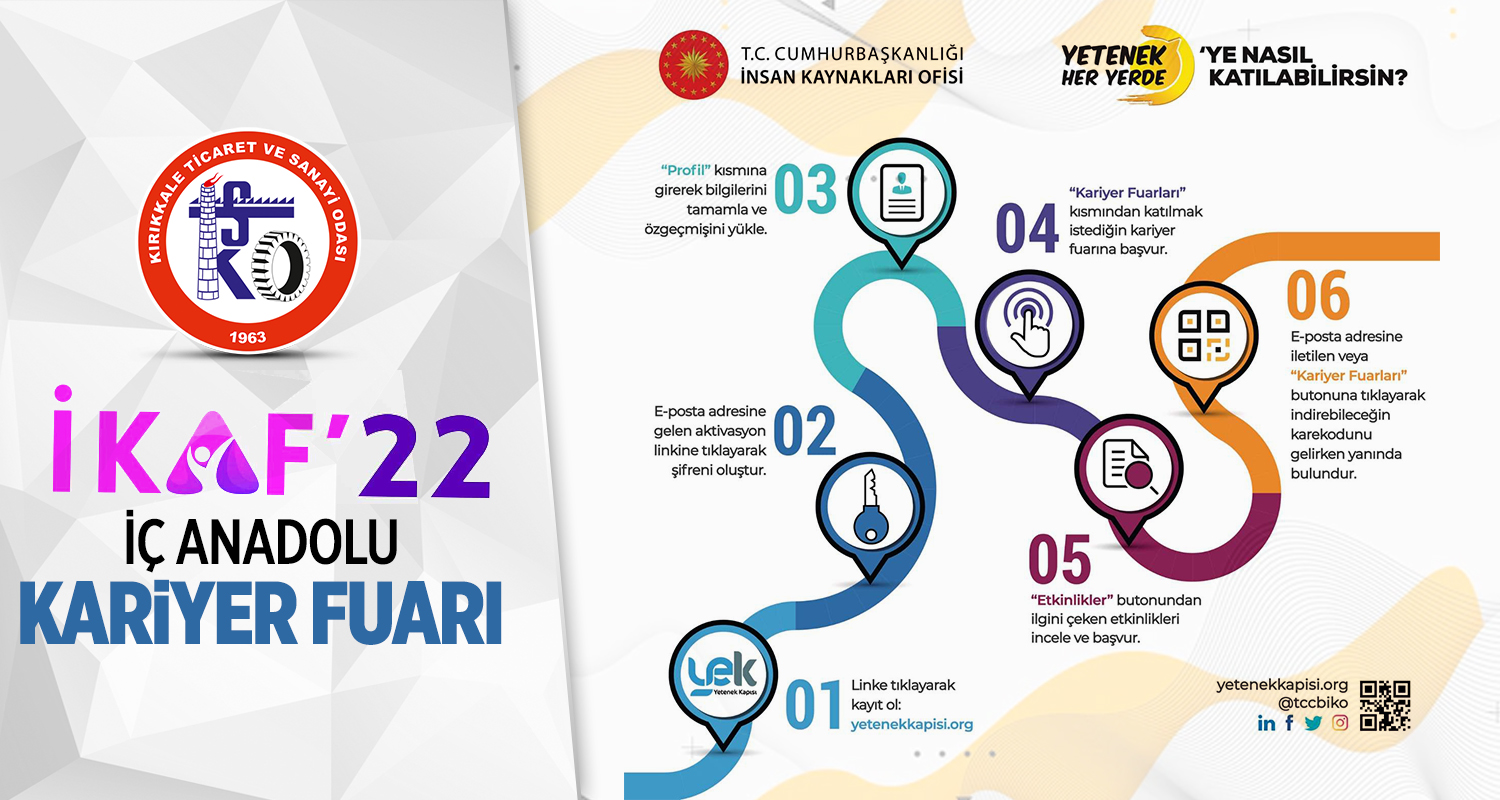 Bu büyük organizasyon hakkında daha kapsamlı bilgi edinmek için https://ikaf.erciyes.edu.tr/ web adresinden İKAF’22 web sitesini ziyaret edebilirsiniz. Fuar tanıtım broşürüne ise https://ikaf.erciyes.edu.tr/ikaf22Brosur/ikaf22Brosur.pdf bağlantısından erişebilirsiniz. Fuara katılım için Cumhurbaşkanlığı İnsan Kaynakları Ofisi tarafından öğrenci ve mezunların nitelikli istihdamına katkı sağlamak amacıyla geliştirilmiş olan Yetenek Kapısı Platformu üzerinden ve https://ikaf.erciyes.edu.tr/Basvuru.html linkine tıklayarak başvuruda bulunmanız gerekmektedir. Ayrıca ilgili sayfada sponsorluk hakkında daha ayrıntılı bilgi sahibi olabilirsiniz.