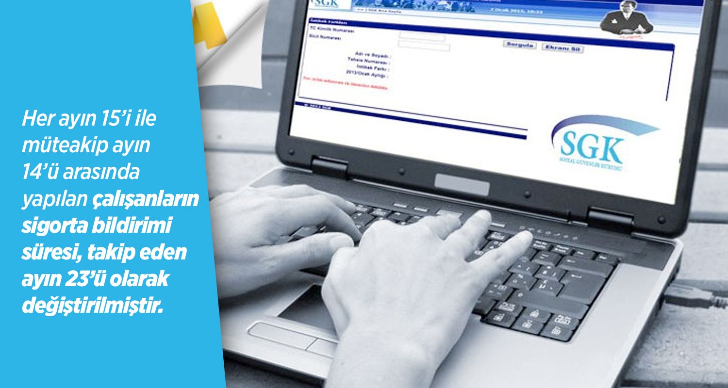 Sosyal Güvenlik Kurumunun, 5.12.2017 tarih 30261 sayılı resmi gazetede yayımlanarak 1.1.2018’den itibaren yürürlüğe giren Sosyal Sigorta İşlemleri Yönetmeliğinin 102. maddesinin 3. fıkrasının (b) bendi ile (c) bendinin (2) numaralı alt bendinde yaptığı değişiklikle her ayın 15’i ile müteakip ayın 14’ü arasındaki çalışmaları karşılığı ücret alan çalışanların sigorta bildirimi süresi, takip eden ayın 23’ü olarak değiştirilmiştir.