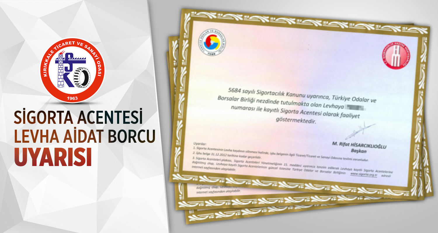 Odamız yetki alanındaki aktif olan sigorta acentesi üyelerimizin mağduriyet yaşamamaları için aidat ödemelerini kontrol etmelerini, ödenmemiş Levha aidat ve oda aidat borçlarını ödemeleri gerektiğini hatırlatır,